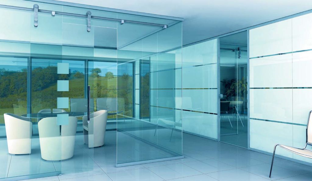 Торговые центры, офисные и административные здания, оформленные в современном стиле. В подобных помещениях устанавливаются цельностеклянные перегородки. Они позволяют не только эффективно зонировать пространство, но и способствуют проникновению света в самые отдаленные от окон уголки.