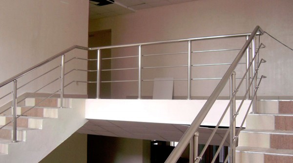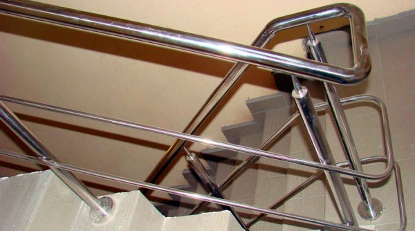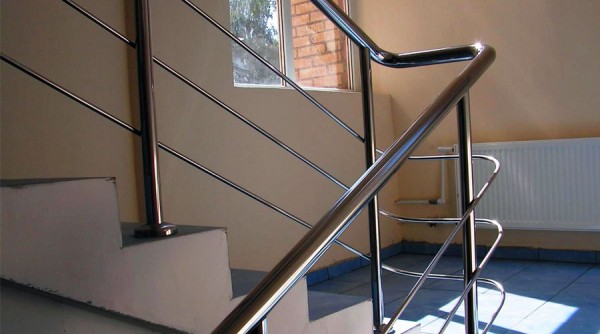 - Устойчивость к коррозии – это главное достоинство ограждений, выполненных из хромоникелевых сплавов. Кроме этого, поручни, изготовленные из данного материала, успешно выдерживают практически любые неблагоприятные условия – повышенную влажность, влияние химически агрессивных веществ и пр. Благодаря таким качествам, перила для лестниц устанавливаются не только внутри помещений, но и как часть внешних лестничных конструкций.