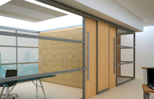 Стационарные перегородки. Алюминиевые конструкции с различными наполнителями: сэндвич-панели, МДФ, гипсокартон, стекло. Предусмотрено глухое, прозрачное или комбинированное заполнение. Высота — до 5 метров. Две системы офисных перегородок — Forum и Status. Отличаются способом соединения секций и принципом крепления. Под заказ устанавливаются раздвижные и распашные двери, жалюзи. Стационарные офисные перегородки обеспечивают звукоизоляцию до 40 дБ.