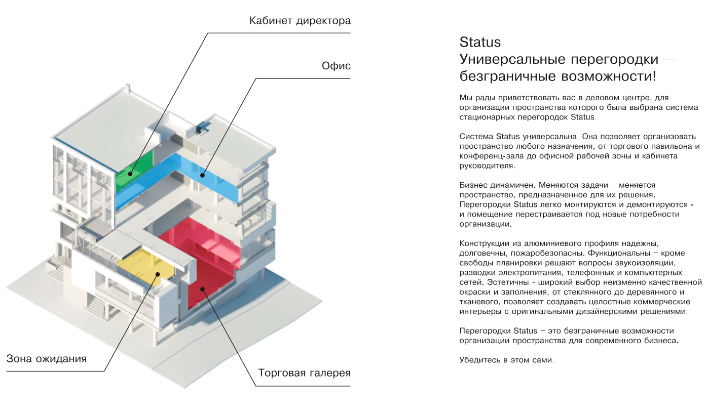 Конструкция Status состоит из алюминиевого профиля с заполнением различными материалами: пластиковые блоки, закаленное стекло, МДФ, сэндвич-панели, гипсокартон. В стеклянных створках есть возможность встроить горизонтальные жалюзи. Внутри перегородок допускается прокладка электрической проводки и коммуникаций.